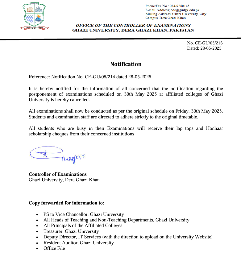 Notification regarding the postponement of examinations scheduled on 30th May 2025 at affiliated colleges of Ghazi University is hereby cancelled.