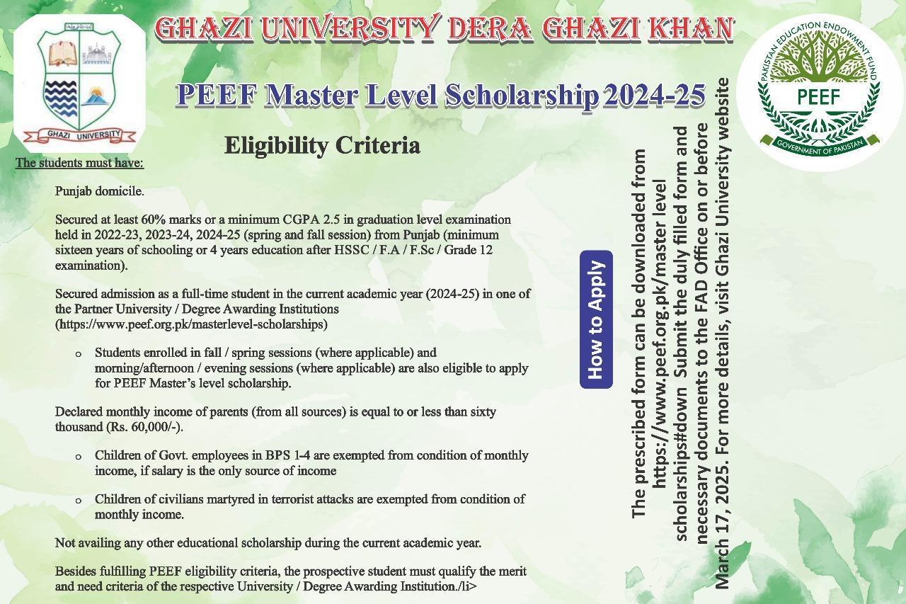 - Secured admission as a full-time student in the current academic year (2024-25) in one of the Partner University / Degree Awarding Institutions (https://www.peef.org.pk/masterlevel-scholarships)